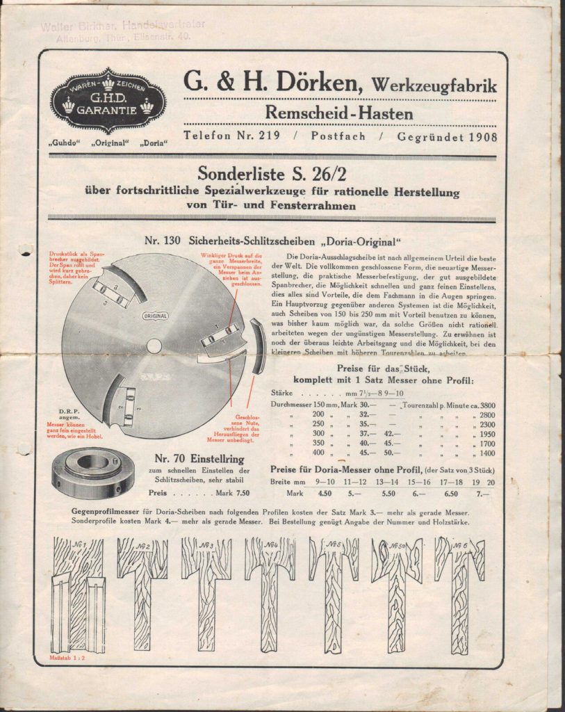 Remscheid, Germany, has a world wide reputation for being the center of precision tool manufacturing. GUHDO history began, when, in this town in 1908 brothers Gustav and Hugo Doerken founded a company to manufacture precision tools for the woodworking industry, specifically circular saw blades and machine knives (corrugated, planer knives and paper cutting knives). They named their company GUHDO, an acronym from the combination of the founder’s first and last name initials, and quickly developed an offering of popular woodworking tools. Below is undoubtedly the oldest GUHDO Sales Flyer dating back to 1925!