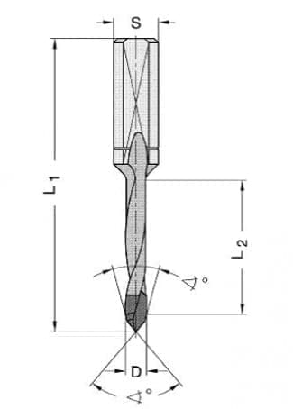 Carbide tipped V-point (thru hole) drill for use in cabinet and closet construction. The shank features a height adjustment screw and a landed flat for set screw tightening. The V-Point geometry prevents edge blowout when the bit exits material on the bottom. Special Sizes available on request. If using this bit in a toolholder / collet setup, please refer to this information for proper mounting.