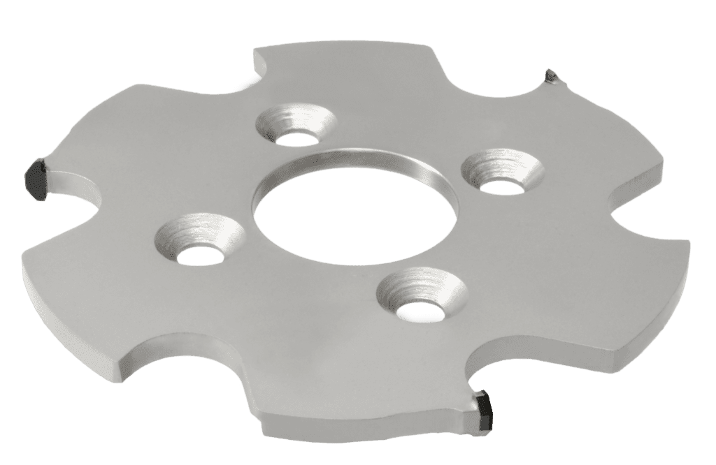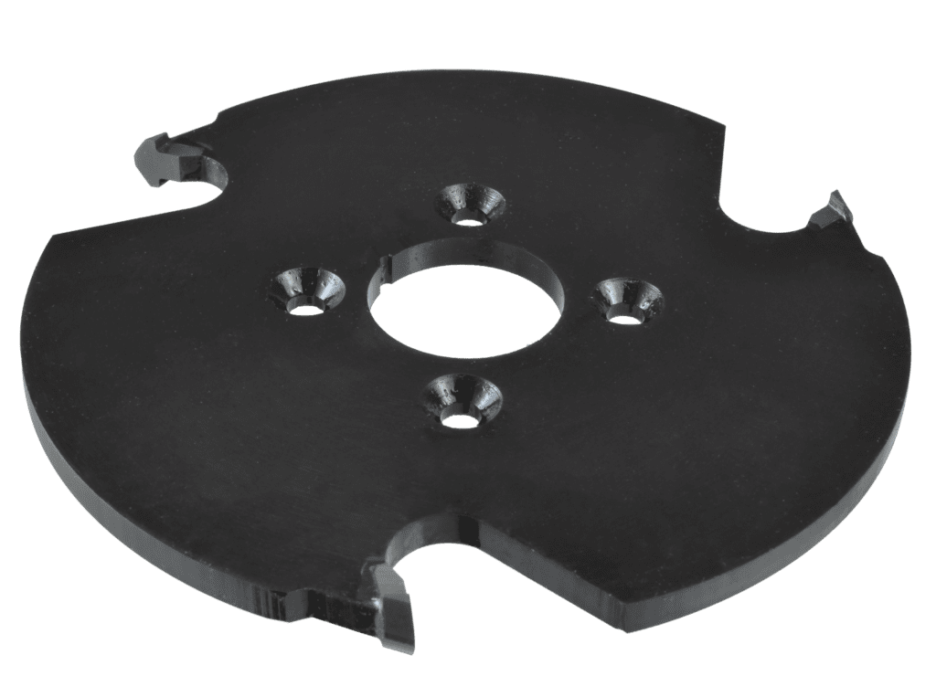 For profile grooving, we offer the following options: a diamond tipped, 100mm diameter x 7mm kerf x 30mm bore, 3-wing groover (7.3116.101.30), and for routing applications, we have two options: a solid carbide or diamond (PCD) tipped versions. For the router bit options, 5-axis machining capability is required.